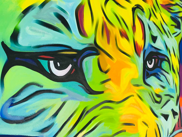Statt klassischer Naturfarben nutzt Fischer ein wildes Spektrum aus Gelb, Blau, Grün, Rot, Pink und Orange. Die Farbverläufe wirken wie flüssige Energie – als ob das Tier selbst aus Licht, Bewegung und Emotion bestünde. Die klaren schwarzen Konturen geben dem Gesicht Struktur und Dramatik.